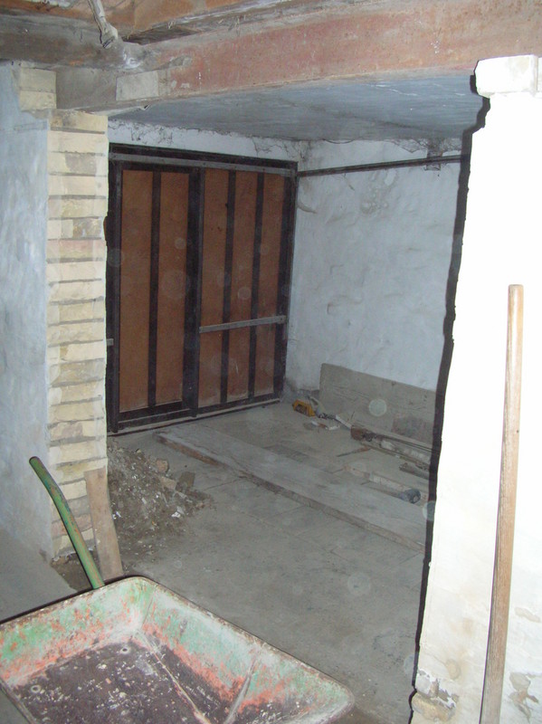 Egy 2,2méter hosszú "I" profillal támasztottuk alá azt a részt, ami alól kilesz ütve a fal a két garázs között. Először egy kis hidraulikus emelővel az egész hóbelebanc lassacskán fel lett emelve, majd nagynehezen becsusztattuk a profilt a helyére...potom 5 óránba tellett...khömmm, profik vagyunk, nincs mese :P