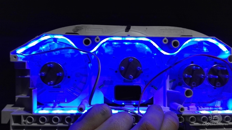 Rendeltem dip ledes rizsszem izzókat kék színben. Miután becsavargattam őket, nagyon bénán nézett ki a műszerfal. Foltos volt, itt-ott váltakozott a világoskék-zöld árnyalat, bazáros tuningvilágítás lett belőle. Már majdnem feladtam a történetet, amikor kitaláltam, hogy egyszerű 3528-as sötétkék led szalaggal végigragasztom a belsőt, hogy egyenletes fényereje legyen. Ez nem volt olyan egyszerű, a kritikus helyeken műanyag ragasztóval megtámogattam a szalagot. A szalag tápellátását a rizsszem izzók helyére forrasztottam, két különböző izzó helyére.